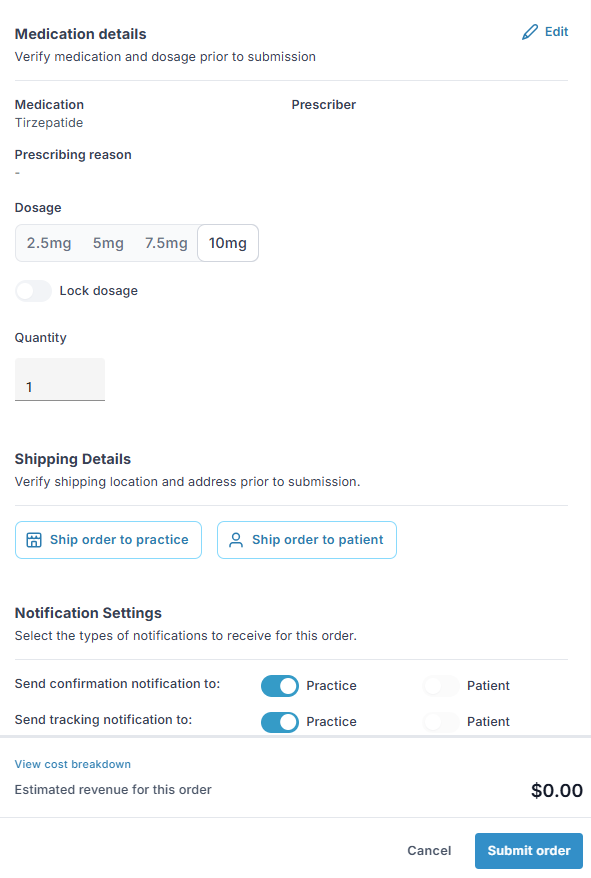 Then select the dose you want to prescribe along with the quantity either 1 or 2. 2 vials can be ordered per patient in a 28-day period. Then select Ship to Practice or Ship to Clinic. Finally, Submit the order.